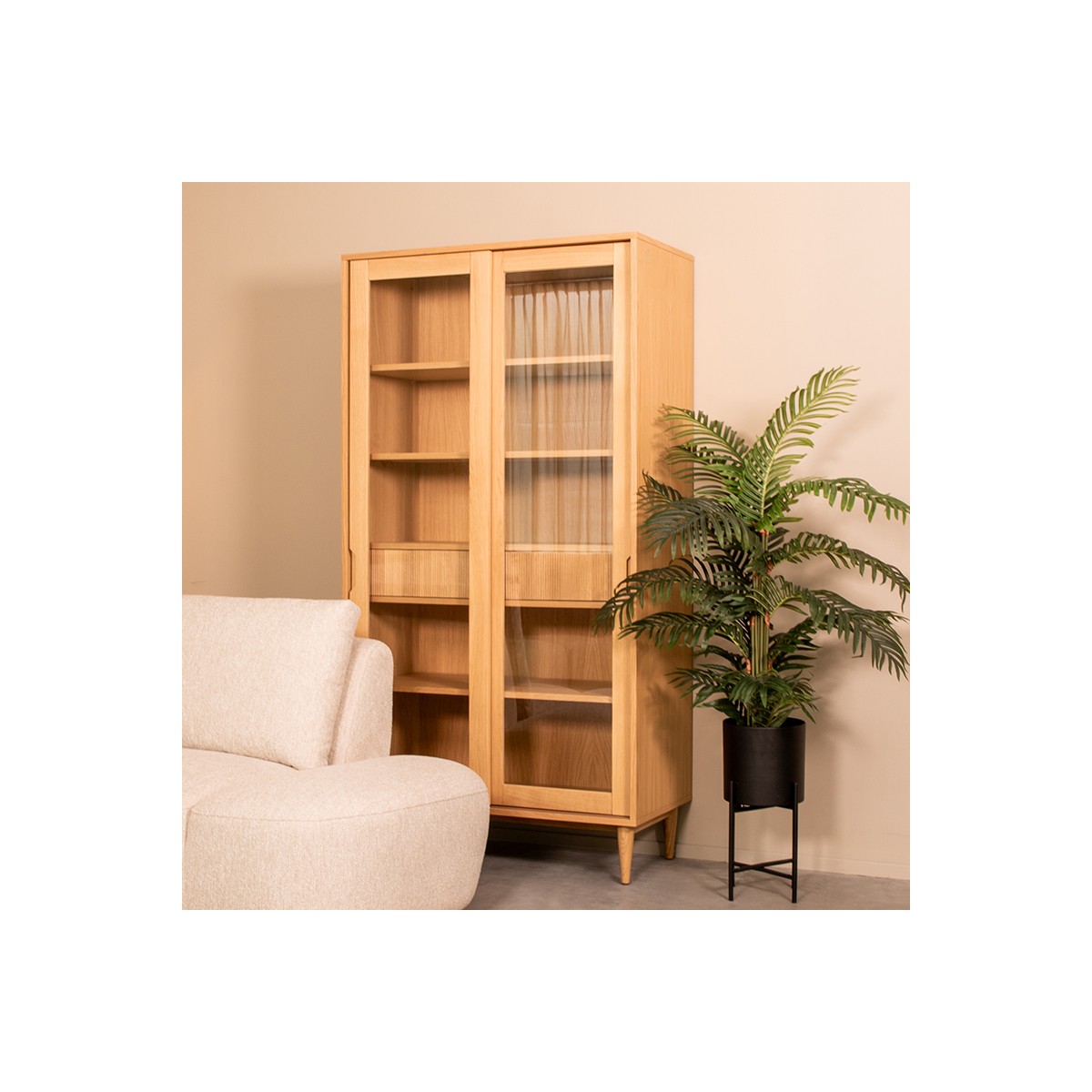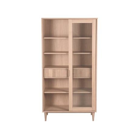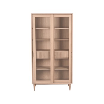 De Vitrinekast Jule, vervaardigd uit hoogwaardig eikenhout, combineert elegantie met functionaliteit. Met een natuurlijke afwerking, een breedte van 100 cm en een hoogte van 180 cm, biedt deze kast voldoende ruimte om je kostbaarheden te etaleren in elke moderne woonruimte.